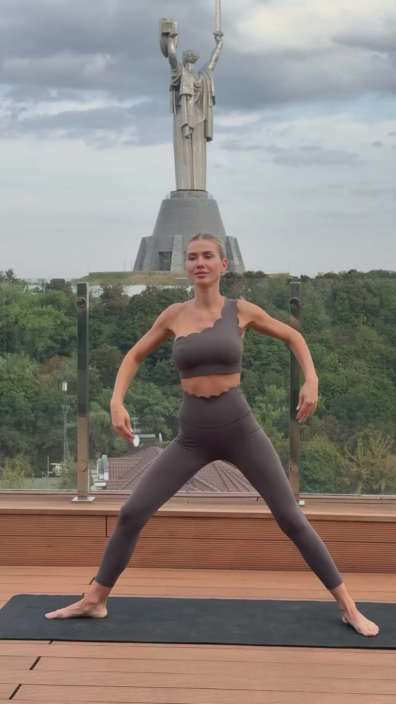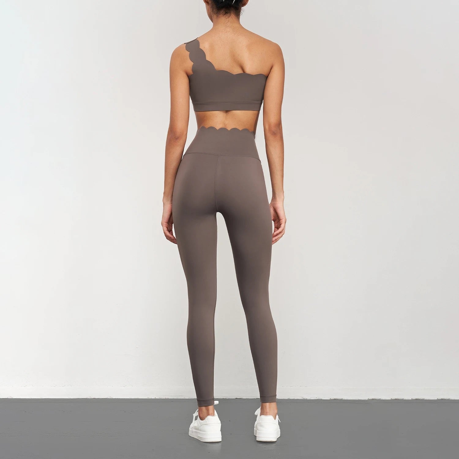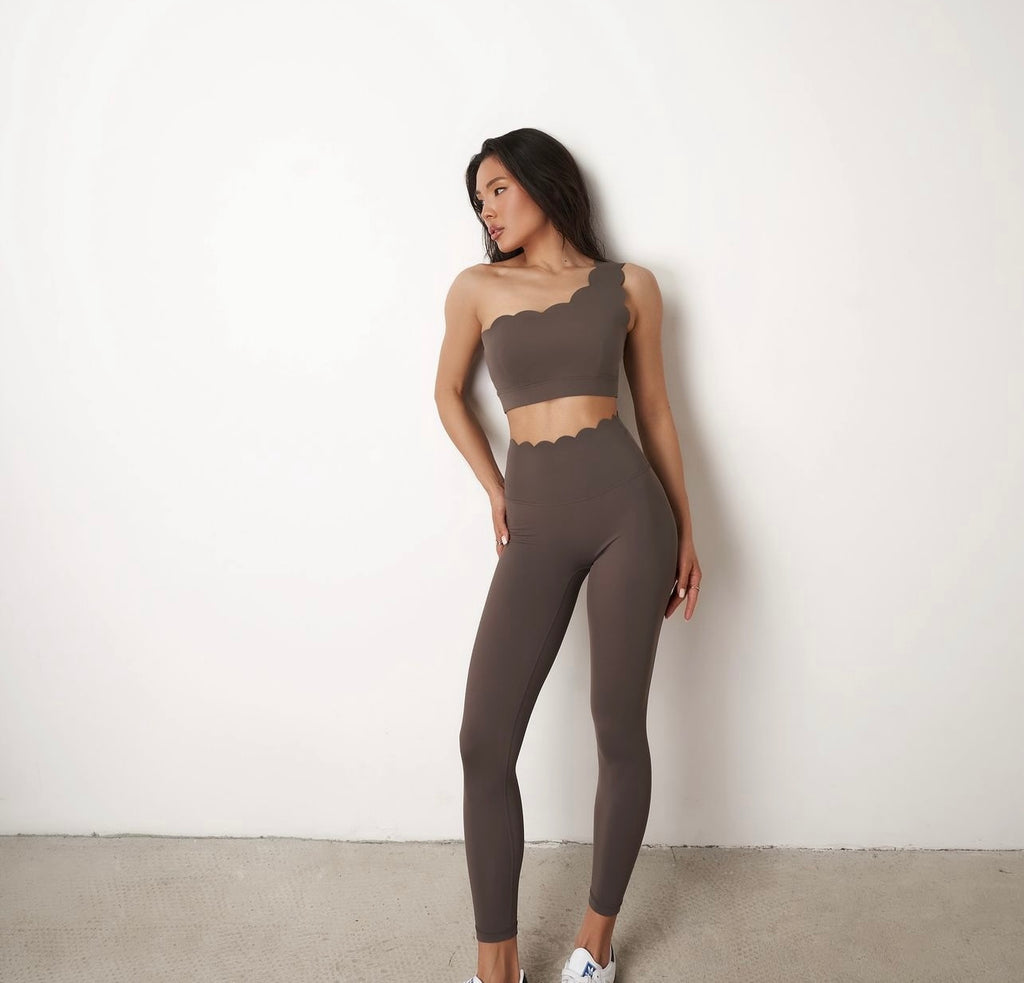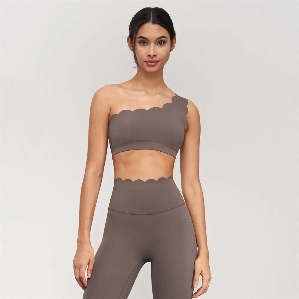 Indulge in unparalleled comfort with our buttery-soft one-shoulder sports bra, featuring an asymmetrical half-moon design. Revel in its impeccable contouring that molds flawlessly to your body, ensuring optimal support throughout your workout sessions. The one-shoulder cut with an elegant scallop detail offers a chic edge—elevate your style by effortlessly pairing it with high-waisted leggings or skirts.