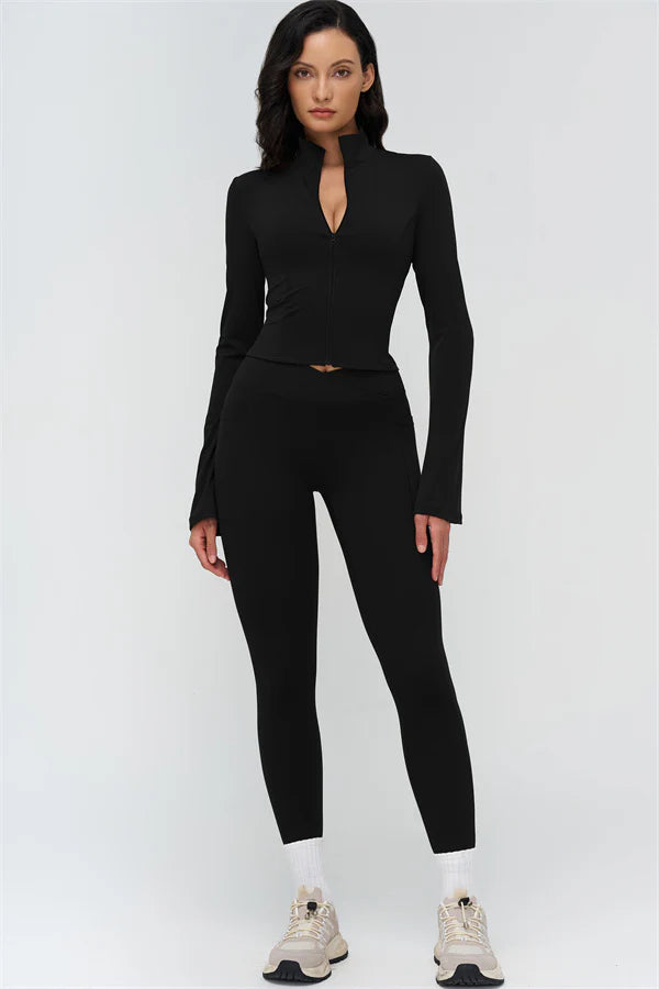Designed for a flattering silhouette and functional performance. The fitted jacket features a full-zip high collar, long flared cuffs for an elegant flow, and a waist-sculpting design that hugs your curves