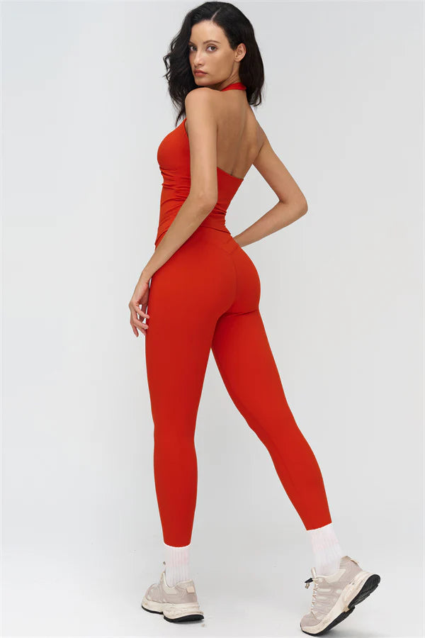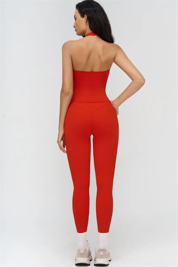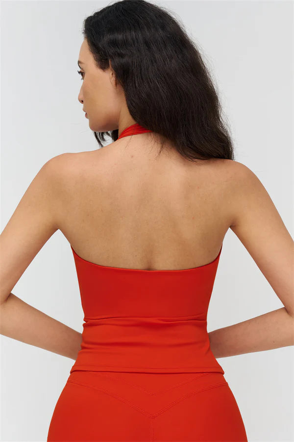 Overlapped V-neck halter design that flatters the shoulders and elongates the neckline